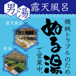 男湯の「露天風呂」と「壺湯」は機械トラブルのため「ぬる湯(冷たいです)」で営業しております